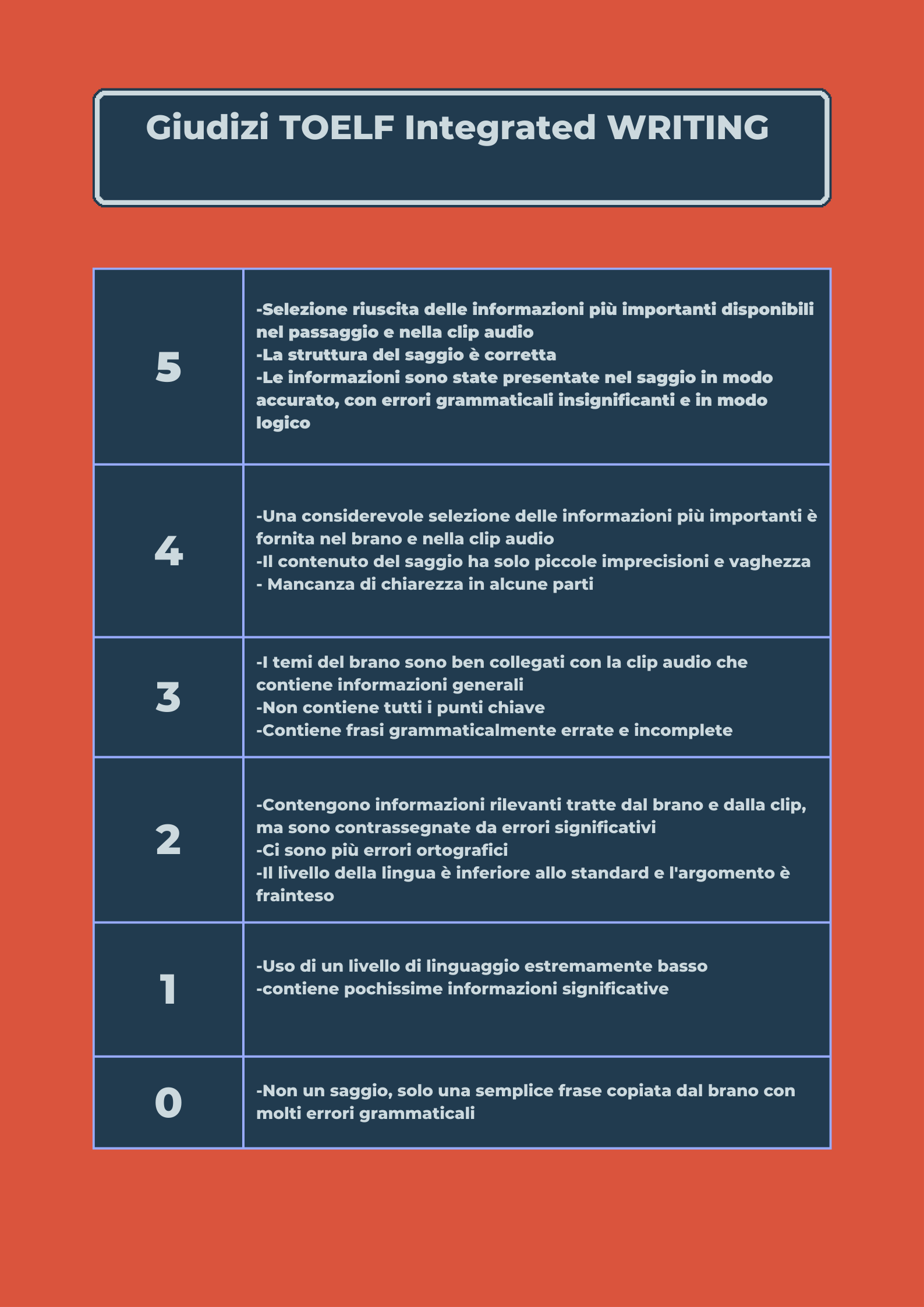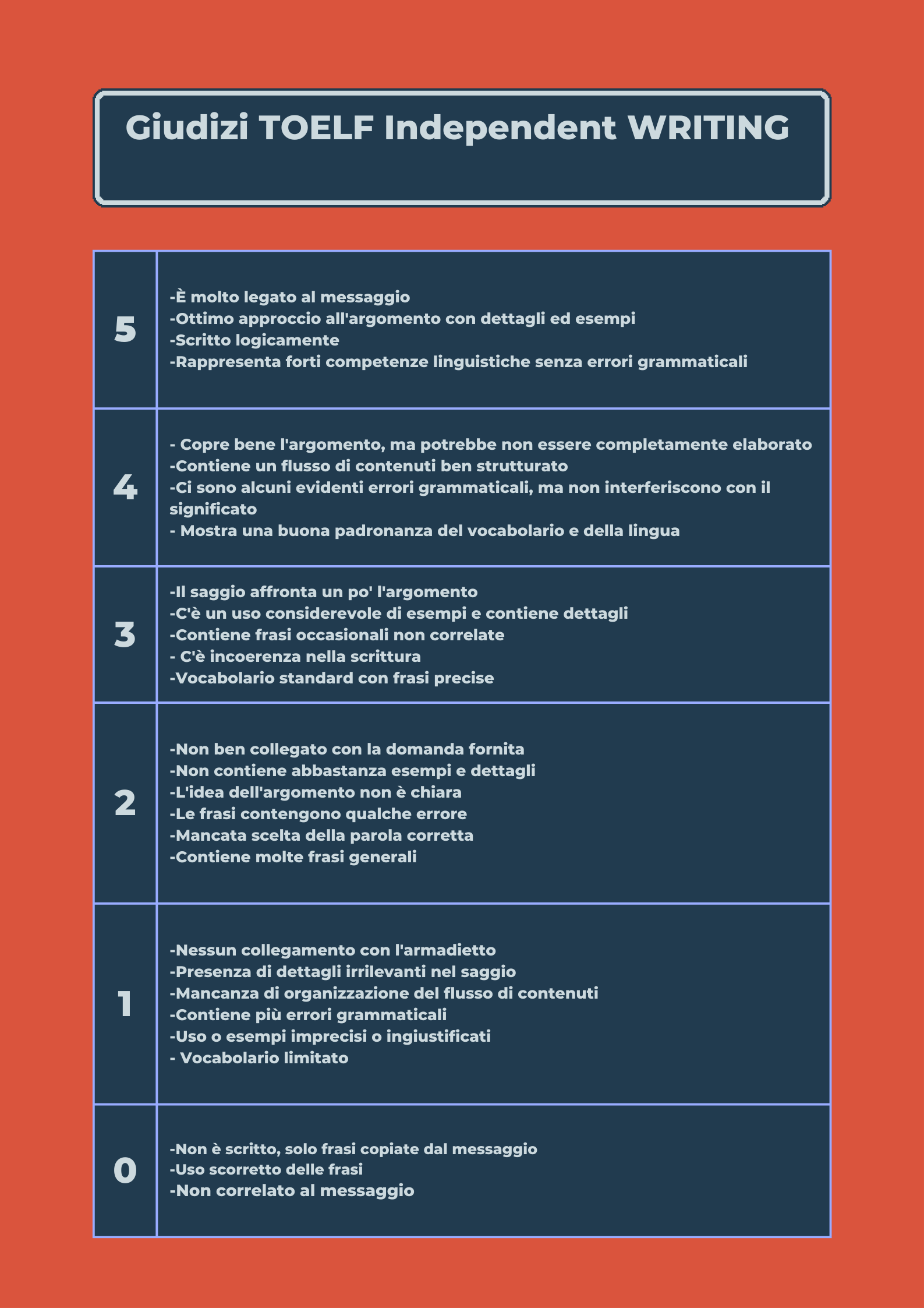 La sezione Writing del TOEFL iBT misura la tua capacità di scrivere in inglese in un ambiente accademico e che sei in grado di presentare le tue idee e concetti in modo pulito e organizzato.